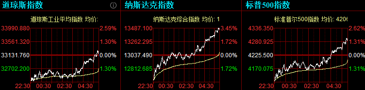 宽客财经2月25日讯,标普500指数收涨63.20点,涨幅1.50%,报4288.70点。道琼斯工业平均指数收涨92.07点,涨幅0.28%,报33223.83点,美股盘初一度重挫约860点。纳斯达克综合指数(纳指)收涨436.10点,涨幅3.34%,报13473.59点。