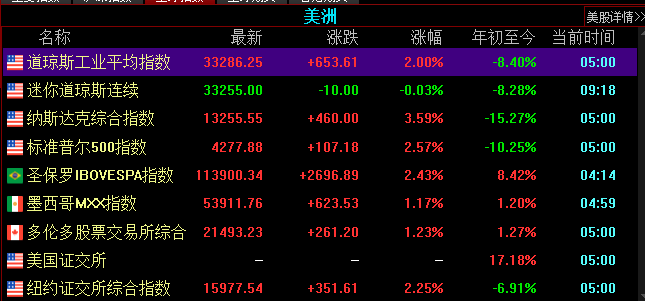 宽客财经3月10日讯,昨天美股三大股指大幅度首航,其中标普500指数收涨107.18点,涨幅2.57%,创2020年6月份以来最大单日涨幅,报4277.88点。 道琼斯工业平均指数收涨653.61点,涨幅2.00%,报33286.25点。 纳斯达克综合指数(纳指)收涨460.00点,涨幅3.59%,报13255.55点。 纳斯达克100指数收涨3.58%,报13742.20点。纳斯达克生物科技指数收涨3.17%,报3979.07点。 罗素2000指数收涨2.71%,报2016.29点。 费城半导体指数收涨3.97%,报3282.18点。 费城证交所KBW银行指数收涨4.15%,报125.46点。 恐慌指数VIX收跌7.71%,报32.42。 |