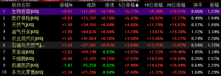 本周美国三大指数大跌。其中昨天(北美时间4月8日)标普500指数收跌11.93点,跌幅0.27%,报4488.28点,本周累计下跌1.27%,创最近一个月最大单周跌幅。道琼斯工业平均指数收涨137.55点,涨幅0.40%,报34721.12点,本周累跌0.28%。纳斯达克综合指数(纳指)收跌186.30点,跌幅1.34%,报13711.00点,本周累跌3.86%。 本周美国板块方面,医药类涨幅居前,其中生物疫苗,医疗保险,和天然气涨幅居前,本周分别上涨5.715,5.43%和4.66%。看一看出当前对市场有决定性作用的还是疫情和俄乌冲突引起的能源价格。其他排名前十的板块多数也是也这两个事件相关。 |
