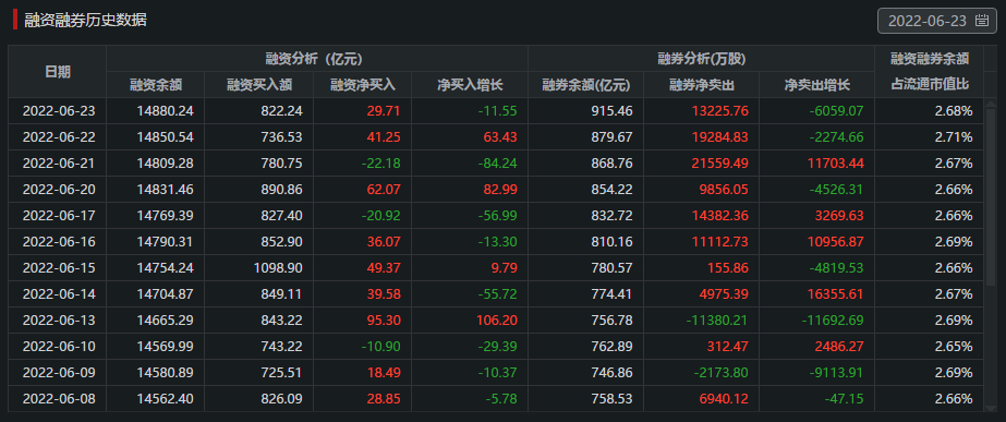 宽客财经6月24日讯,截至6月23日,上交所融资余额报7994.7亿元,较前一交易日增加4.38亿元;深交所融资余额报6885.54亿元,较前一交易日增加25.33亿元;两市合计14880.24亿元,较前一交易日增加29.71亿元。两融占流通盘比例回到2.68%。
