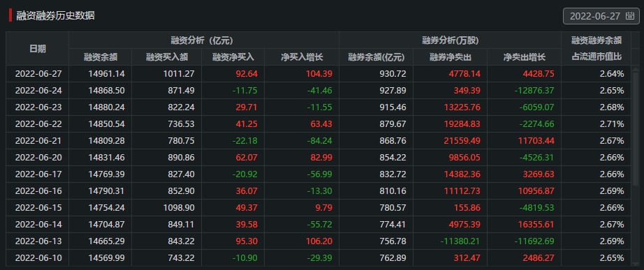 6月28日讯,截至6月27日,上交所融资余额报8041.53亿元,较前一交易日增加50.51亿元;深交所融资余额报6919.61亿元,较前一交易日增加42.14亿元;两市合计14961.14亿元,较前一交易日增加92.65亿元。融资融券余额占流通市值比为2.64%。