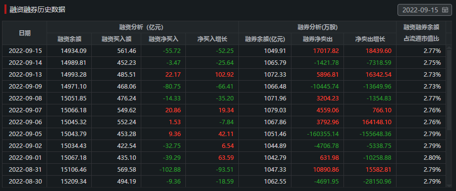 宽客财经9月16日讯,截至9月15日,上交所融资余额报7965.45亿元,较前一交易日减少27.37亿元;深交所融资余额报6968.64亿元,较前一交易日减少28.35亿元;两市合计14934.09亿元,较前一交易日减少55.72亿元。融资融券余额占流通盘比例为2.77%。