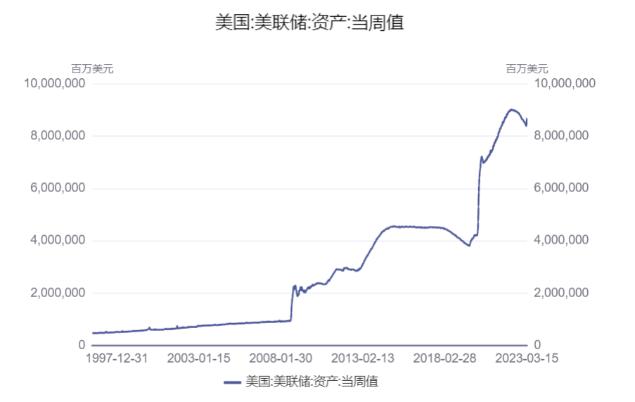二、货币主义的山穷水尽 货币主义发展到现在造成的严重问题是:不断的QE(量化宽松),不断的向市场注入流动性,造成全球主要央行资产负债表的急剧膨胀和各国债务的极速扩张。 以美国为例,美联储的资产负债表从有数据记录以来,1996年美国资产负债表为4670.46亿,而去年高达90119.58亿,二十多年时间资产膨胀了20多倍。 而对应的GDP从1996年到2022年仅仅增长了一倍,由此可见央行资产负债表扩张的速度之快。特别是2020年以来的疫情期间,美国的资产负债表急速扩张,从4万亿附近直接上冲到9万亿。 |