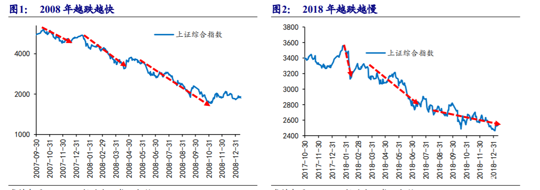 年熊市的对比,2008 年熊市初期,市场跌速很慢,但之后不断加速。而 2018 年熊