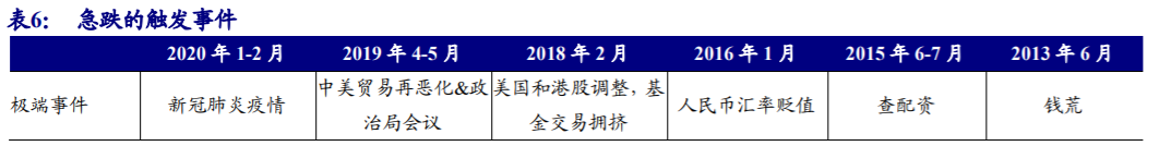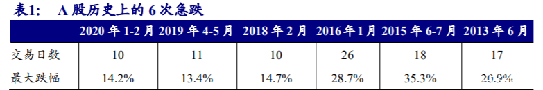调整时间短,幅度大,是一次急跌。我们详细对比了 2013 年以来的 6 次急跌:2020