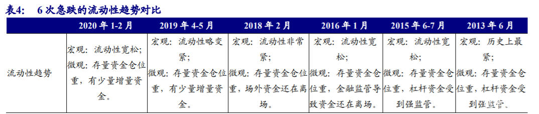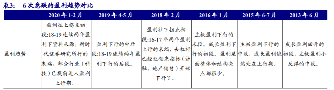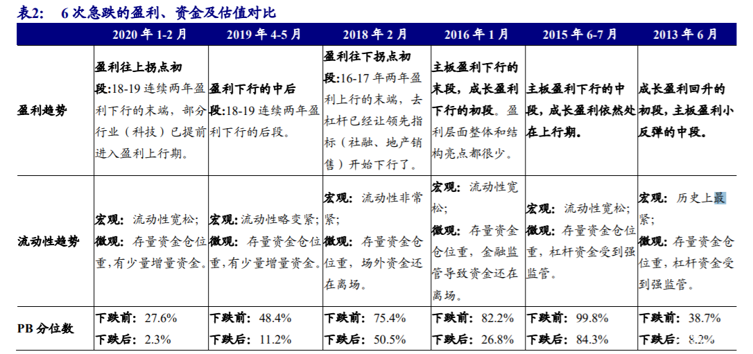 年最近半个月也很快。 我们认为,这背后反映的是绝对收益投资者增多和杠杆资金的影响,这种情况 以后大概率是常态。 2、 基本面角度对比 6 次急跌 基本面大趋势的对比,我们重点分析了盈利、流动性和估值这三个维度。我们 认为对比这 6 次调整,当下的市场盈利趋势能够排到第 2 位,流动性趋势能够排到 第 1 位,估值能够排到第 2 位,具体排序如下: (1)盈利趋势:2013 年 6 月>2020 年 1-2 月>2019 年 4-5 月>2015 年 6-7 月>2016 年 1 月>2018 年 2 月; (2)流动性:2020 年 1-2 月>2019 年 4-5 月>2016 年 1 月>2018 年 2 月>2013 年 6 月>2015 年 6-7 月; (3)估值:2013 年 6 月<2020 年 1-2 月<2019 年 4-5 月<2018 年 2 月<2016 年 1 月<2015 年 6-7 月; 2.1、 盈利趋势对比 对于一个板块或整个市场来说,如果它的盈利是处在上行趋势,受到短期负面 冲击之后,之后的运行应该是比较强的;但如果市场是处在盈利下行的大趋势中, 特别是在初段和中段,受到负面冲击之后,是很难恢复的。 当前盈利处在缓慢往上的拐点附近,如果看绝对数值其实还没有往上,但是因 为有部分领先行业已经出现了盈利改善的趋势,比如说科技(包括新能源车)。而 部分盈利预期比较差的板块应该处在一个下行的末端。对比之前的几次急跌,当下 只比 2013 年 6 月稍微差一点,比其他几次都好。 2019 年 4-5 月,市场处在盈利下行的中后段。2018 年盈利下行,到 2019 年初 盈利还没有改善的迹象,最近半年比较火的电子、传媒、计算机、新能源车,在 2019 年 4-5 月份还没有被市场发掘,那时候只挖掘出了养殖的盈利改善,盈利逻辑 非常少。整体来看,2019 年 4-5 月,不管是整体还是结构,盈利趋势都是没有太多 看点的。 2018 年 2 月,那时候盈利是处在上行的末段,下行还没有开始,但已经有领 先指标开始变差。2018 年 2 月是处在 2016 年到 2017 年连续两年盈利改善的末段, 在 2018 年初,市场一致预期 2018 年全年的盈利环境很难持续超预期了,但自下而 上还没有发现可能会低于预期的点。但如果看宏观指标,包括社融、房地产销售, 发现其实已经下滑的比较厉害了,所以我们认为那个时候是处在盈利下行的初段。 2015 年中和 2016 年初的调整,这两次主板的盈利是在下行的中段,成长盈利 是到了上行的末段,如果去看上市公司业绩,其实成长的业绩到 2015 年甚至 2016 年初的时候还在改善,但如果是看并购等各方面的数据,已经逐渐转入往下的趋势 了。 我们认为 2015 年 6、7 月的时候成长盈利处在末段,主板盈利处在下行的中段, 而到 2016 年初,主板是处在盈利下行的末段,到 2016 年 2、3 季度之后,很多经 济的指标开始慢慢改善,特别是商品的价格在改善,但是在 2016 年 1、2 月市场展 望主板的盈利时,还很难看到这些。 2013 年 6 月,是由钱荒带来的冲击。如果看上市公司的盈利,主板是处在盈 利上行的末段。因为从 2012 年开始到 2013 年,主板有一个盈利小幅反弹的周期, 2013 年年中主板的盈利是处在反弹的后段,钱荒后,市场担心未来经济的下行, 但是主板盈利以及宏观同步指标,都还没开始下行。对于主板的盈利确定进入下行 趋势 2013 年 12 月之后。而成长的盈利是处在上行的中段,或者说是初段略靠后一 点。那个时候相对来说盈利的看点是比较多的,主板是盈利 1 年小反弹的末端,成 长是盈利上行大趋势的初段。 如果把刚刚对比的这几次盈利格局做一个排序,我们认为 2013 年 6 月是最好 的,2020 年现在面临的情况排第 2 位,2019 年 4、5 月排第 3 位,2015 年 6、7 月 和 2016 年 1 月分别排第 4 位和第 5 位,最差的情况是 2018 年 2 月。 2.2、 流动性趋势对比 从流动性的角度去看,对比这 6 次急跌,最大的共性是存量机构的仓位,在调 整之前整体都是偏高。 不一样的地方是,现在至少宏观流动性是偏宽松的,而我们去看 2019 年 4-5月是略微偏紧一点点,2018 年 2 月是非常紧,2013 年 6 月是史上最紧,2015 年 6-7 月和 2016 年 1 月宏观流动性是偏宽松的,但微观流动性是非常紧的,因为当时查 配资、金融监管的影响。 现在的资金格局目前来看是几次冲击中最好的一次情况,首先是没有宏观的负 面冲击在,不像 2013 年年中或者 2019 年的 4-5 月份,那时候都有宏观的流动性收 紧。目前的微观流动性也还可以,政策对股市也是很支持的。当然短期调整过多之 后,必然带来杠杆资金的平仓,这个事没法避免的。这个每次调整都会出现的,但 至少没有外部的比较大的因素来影响股市的资金情况。所以这次的资金格局是我们 对比的 6 次案例里面最好的。 2.3、 估值对比 从估值来看,我们认为目前面临的情况可能能排到第二位,绝对估值处在历次 调历次调整后最低。虽然 2013 年 6 月的静态估值比现在高一点,但那个时候的相 对历史的估值是相对偏低的,就是站在 2013 年,去对比 2013 年以前估值是非常低 的,那个时候不知道 2014 年上半年会到达一个很低的估值。我们说的 2013 年 6 月 更低,是指 2013 年 6 月和 2013 年之前去比,2020 年 1-2 月和 2020 年之前去比。 从基本面趋势来看,可以看到当下的基本面格局可以说是历次急跌中最好的, 盈利趋势能排到第 2,流动性趋势能排到第 1,估值能排到第 1 或者第 2。 这么多案例里面,相似度最高的是 2013 年 6 月。当时盈利的趋势有看点,但 是流动性冲击比较大,估值上这两次都是处在历史很低的位臵。但是这两次在短期 事件上有一些差异,2013 年 6 月的钱荒,不仅会