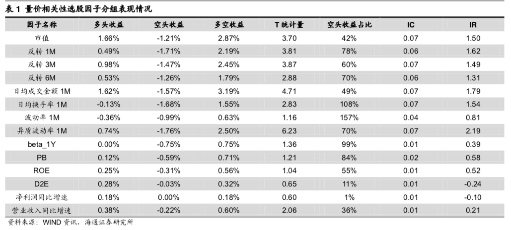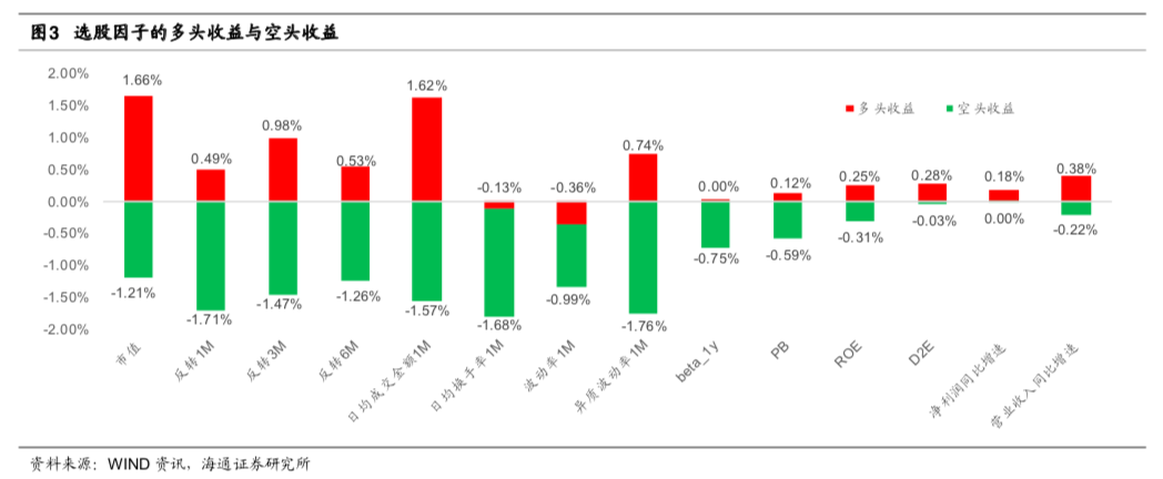 观察上图不难发现,除了极少数强势选股因子外(如,市值、成交金额),多数选股因子空头收益更加明显。下表对于上述选股因子的多头收益、空头收益、IC、IR进行了更加详细的统计。观察下表也可以发现,在IC超过0.07的选股因子中,多数选股因子空头收益占比极高。如1个月反转、3个月反转、日均成交金额、异质波动率等因子其空头收益占比皆高于70%。总体上来看,A股市场中多数选股因子具有较强的空头效应。