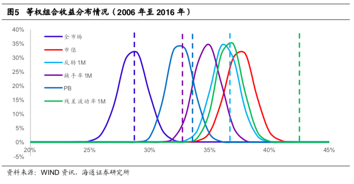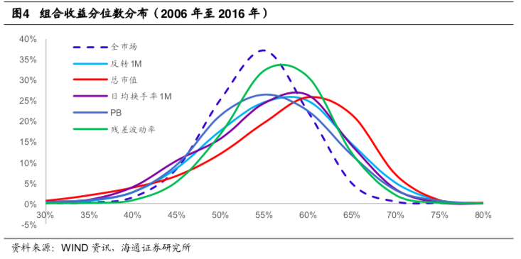 1)从全市场所有可交易的股票中随机选出10%的股票构建等权组合并计算该组合在后一个月的收益分位数(即计算该组合收益能够跑赢同期市场上百分之多少的股票),重复上述抽样1万次;