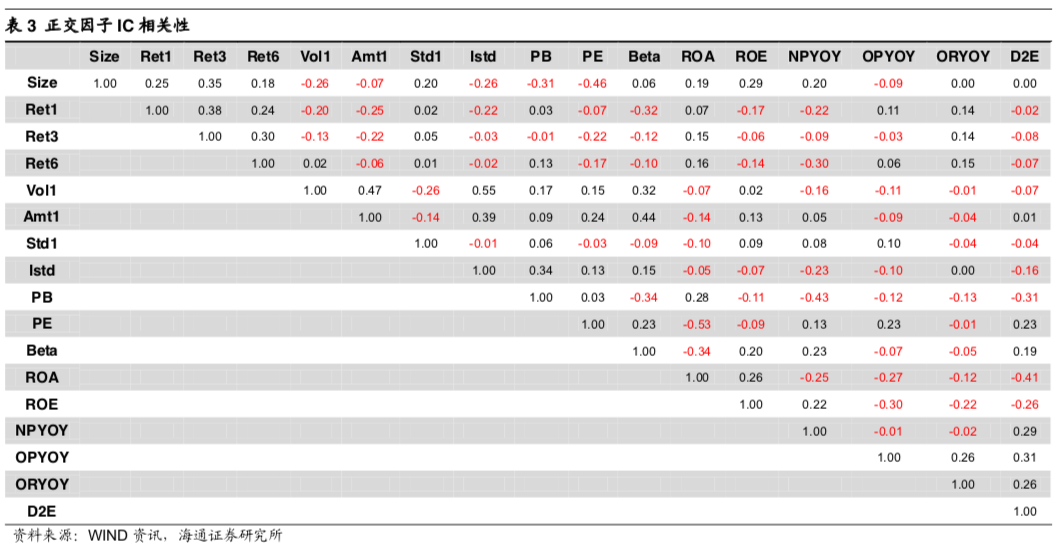 上表中标红的部分为IC相关性为负的因子,根据前文IR的公式,IC为正且与其他因子IC低相关或者负相关的选股因子的加入将有助于多因子组合整体选股能力的提升。