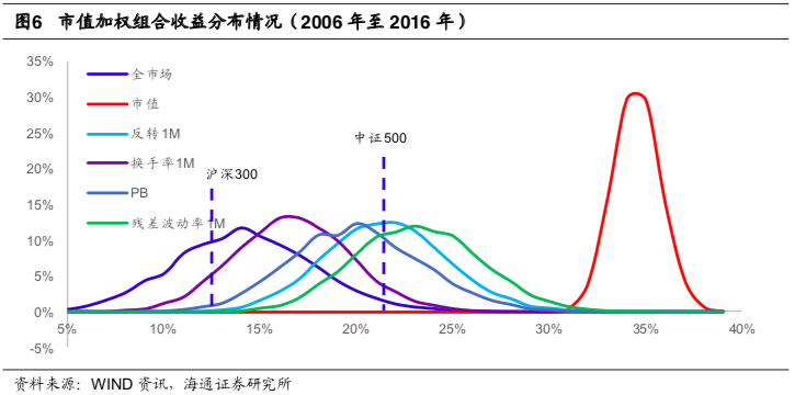 通过上述模拟抽样可得全市场随机组合的收益分位数分布以及因子逆向剔除后随机选股组合的收益分位数分布。下图展示了全市场随机等权组合收益分位数分布情况以及市值、反转、换手率、PB、残差波动率因子逆向剔除随机等权组合收益分位数分布情况。感兴趣的投资者可使用相同方法对于其余选股因子进行类似模拟抽样。