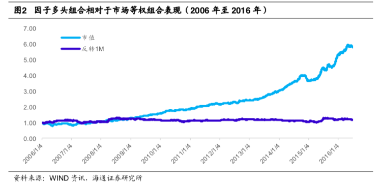 由于A股存在做空方面的限制,投资者可做多因子多头组合股票获取因子多头收益,但选股因子的空头收益很难通过组合构建直接获得。此外,对于多空收益中空头收益占比较高的因子(例如反转因子),其多头组合很难获得明显的超额收益。下图给出了从 2006年以来,月度换仓的市值多头组合以及1个月反转多头组合相对于市场等权组合的相对强弱指数。