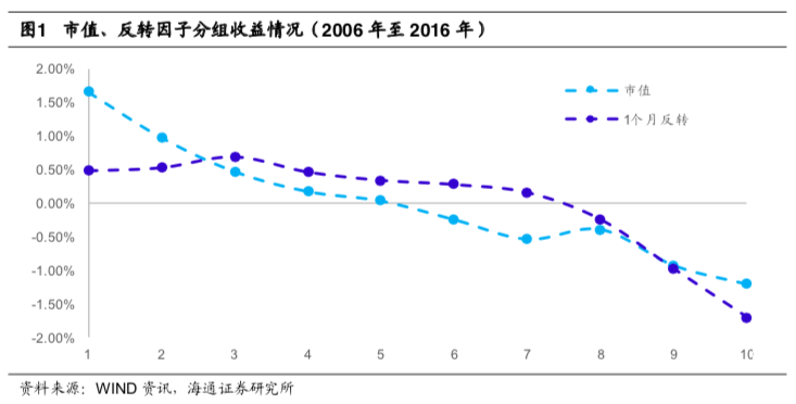 从2006年以来,可在每月月初对于市场上所有可交易股票以其总市值(前1个月涨幅)进行排序并从小到大分成10组并统计随后一个月各组股票相对于市场所有股票平均收益的超额收益。各分组收益情况详见下图。