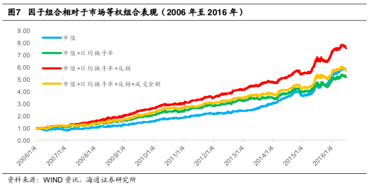 然而多因子模型中因子空头收益转化取决于多方面的因素,并不是所有具有空头收益的选股因子在加入到模型中就能对于组合最终表现产生提升的。现以市值、反转、换手率、成交金额为例进行简单展示。