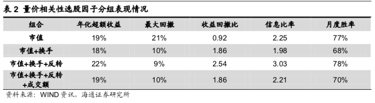 在月度选股框架下,可使用市值因子、1个月反转因子、1 个月日均换手率因子以及1个月日均成交金额因子构建以下四个选股组合;1)市值单因子组合;2)市值、换手率等权因子组合;3)市值、换手率、反转等权因子组合;4)市值、换手率、反转、成交金额等权因子组合。下表展示了上述四个组合与市场等权组合的相对强弱情况。