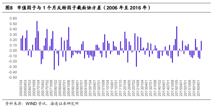 当然,上述分析框架成立的最重要的前提是因子值截面协方差恒定。然而,实际应 用中,各选股因子的因子值截面协方差远非恒定。下图展示了 2006 年到 2016 年间不同 时点上市值因子与 1 个月反转因子之间的截面相关性。