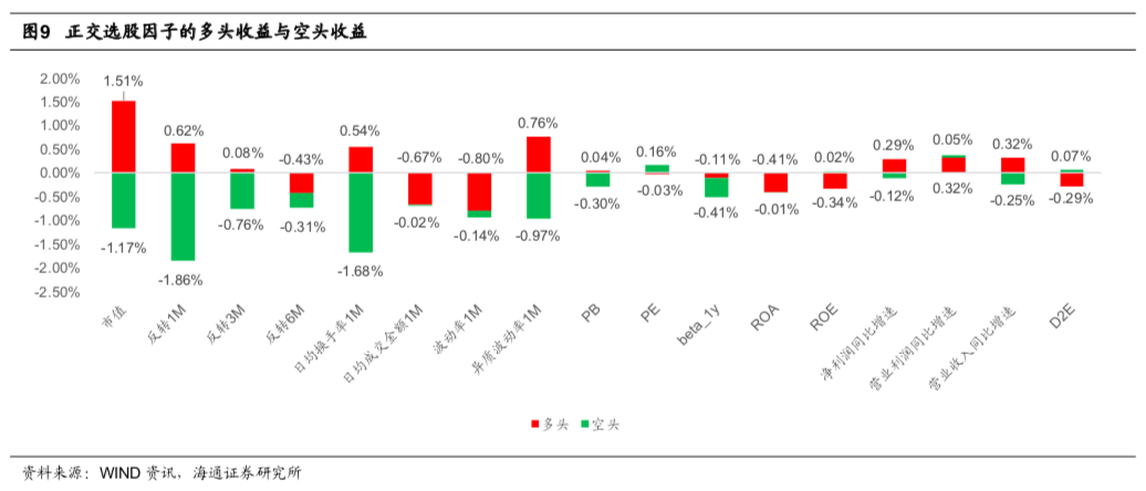 不难发现,两因子都具有较强的多空收益,市值因子月度的多空收益达2.87%,而反转因子的月度多空收益达2.19%。虽然两因子多空收益较强,但因子的多头效应和空头效应却各有不同。对于多头端,市值最小的一组股票在月度上跑赢市场平均收益1.66%,而前期涨幅最小的一组股票仅能跑赢0.49%,相比而言市值因子多头效应更强,更能够选出表现优于市场平均水平的股票。对于空头端,市值最大的一组股票月度上跑输市场平均1.21%,而涨幅最大的一组股票月度上跑输市场平均1.71%,相比而言反转因子空头效应更强。对于上述两个因子,反转因子空头收益占多空收益的78%,而市值因子空头收益仅占多空收益的42%。